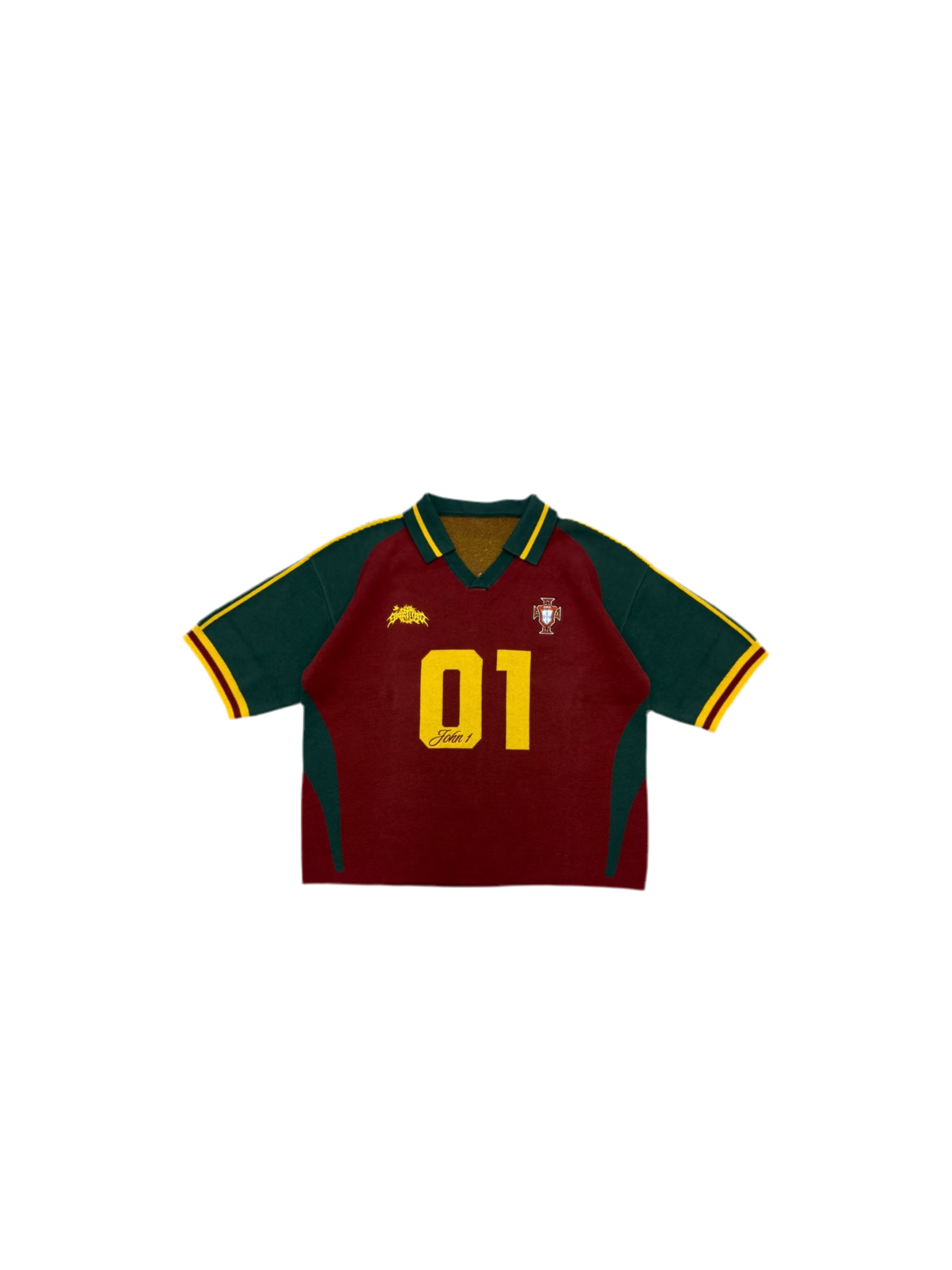 Inspired by Portugal’s classic home kit, this premium knit soccer jersey combines heritage design with a powerful message of faith. Crafted in deep maroon with forest green panels and accented by yellow striping, it delivers a bold and elevated look.