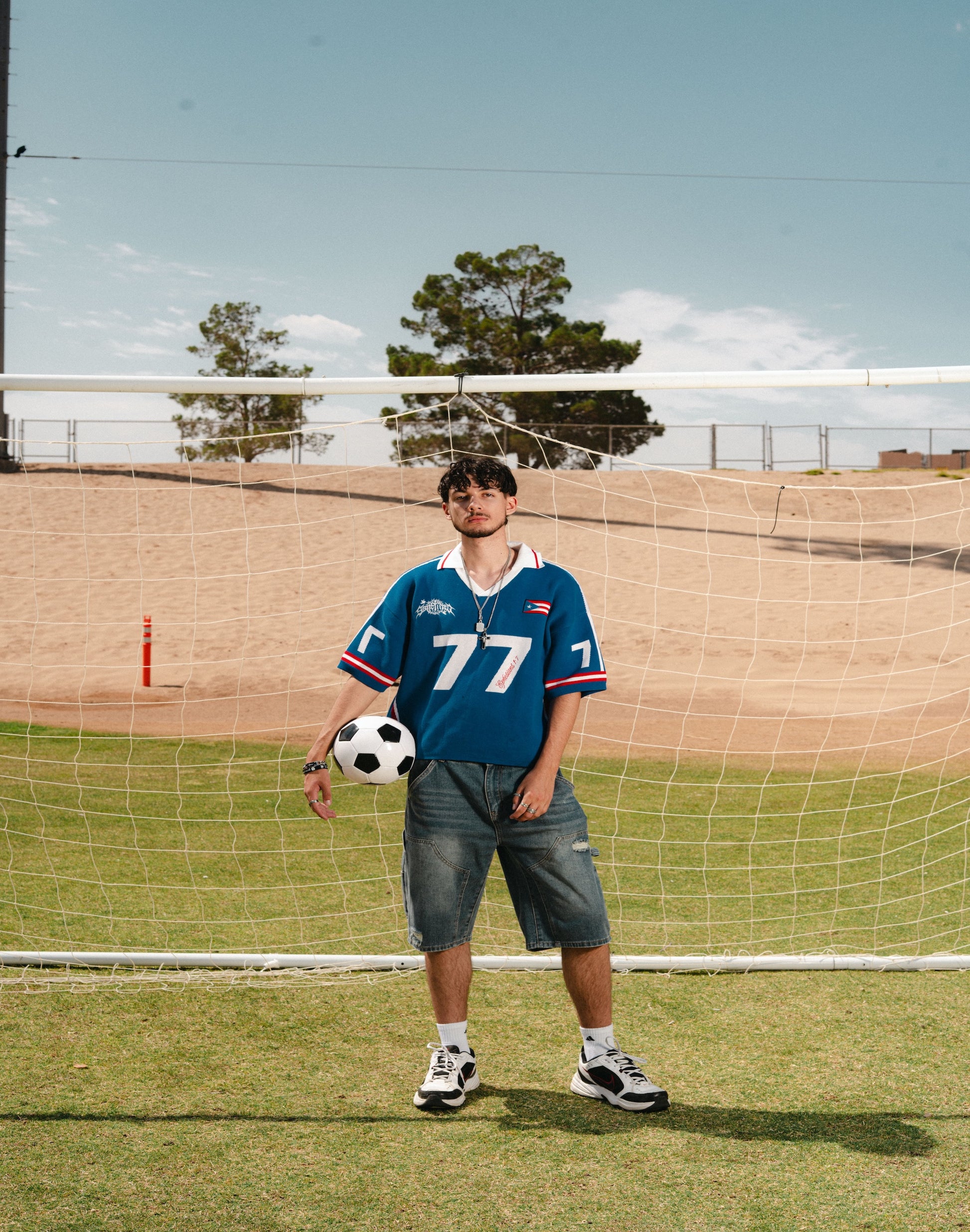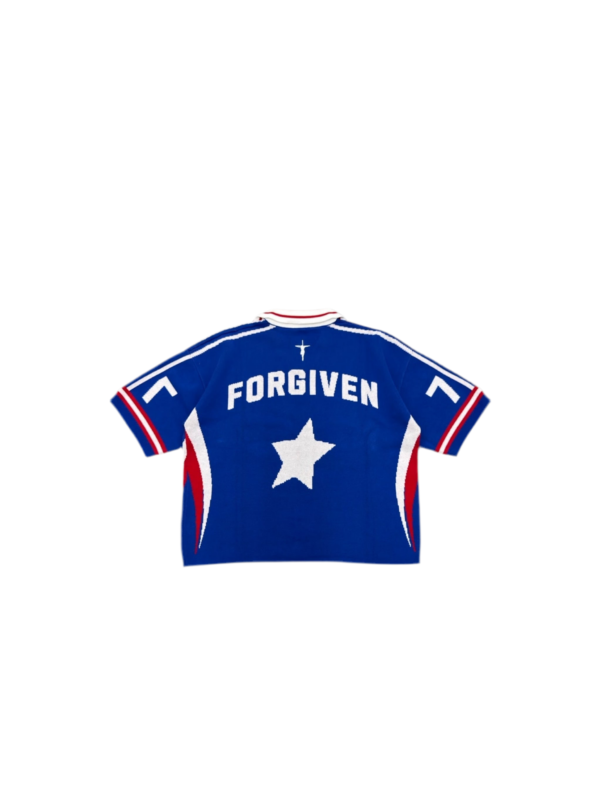 Inspired by Puerto Rico’s iconic home colors, this knit soccer jersey blends national pride with the message of redemption. Designed in a bold royal blue with red and white accents, it features the number 77(which signifies Jesus' grace and forgiveness that he provides for the world) on the front alongside Ephesians 1:7 (KJV) “In whom we have redemption through his blood, the forgiveness of sins, according to the riches of his grace.”